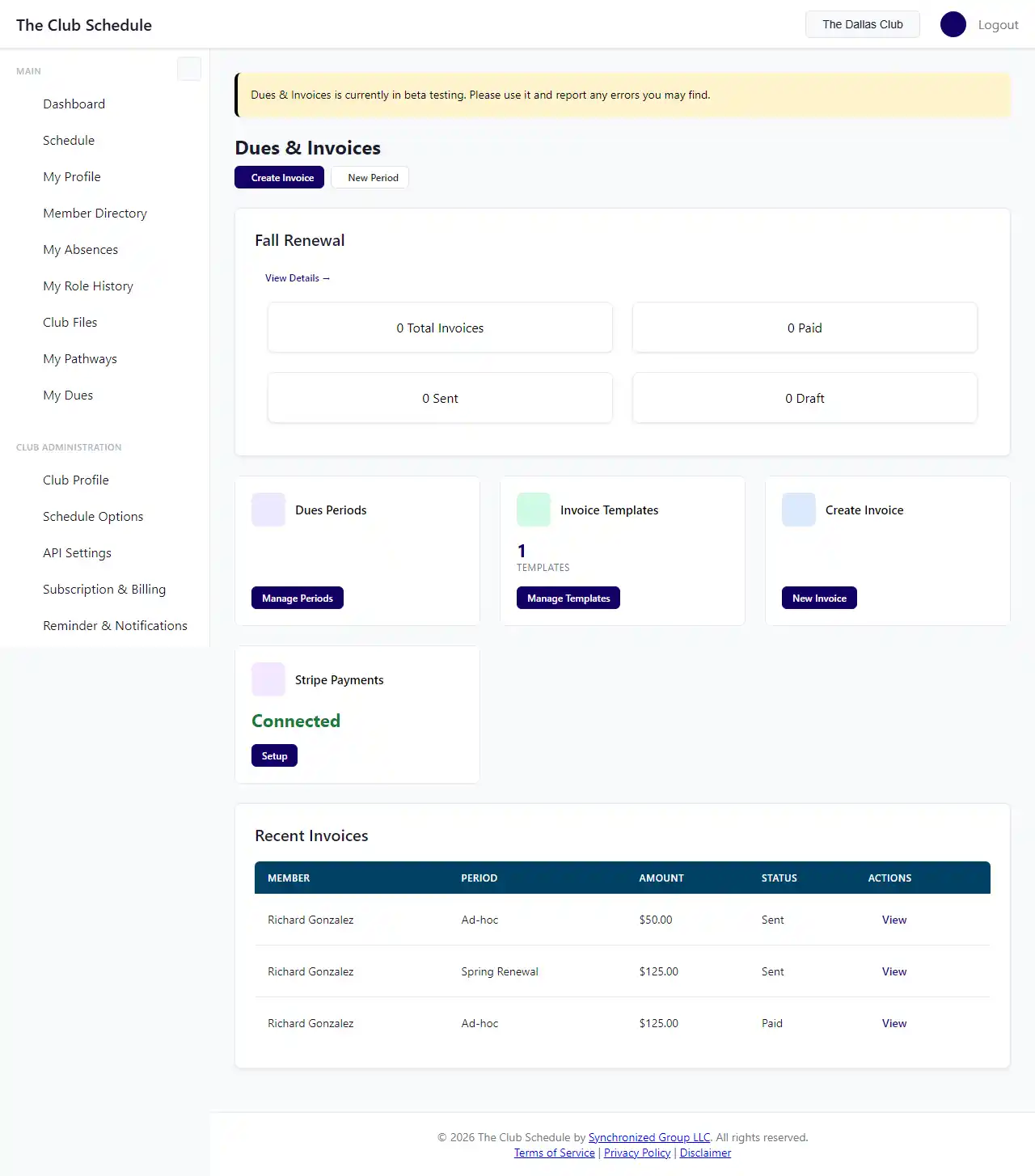 - In the left sidebar under "Club Administration," click Dues & Invoices.