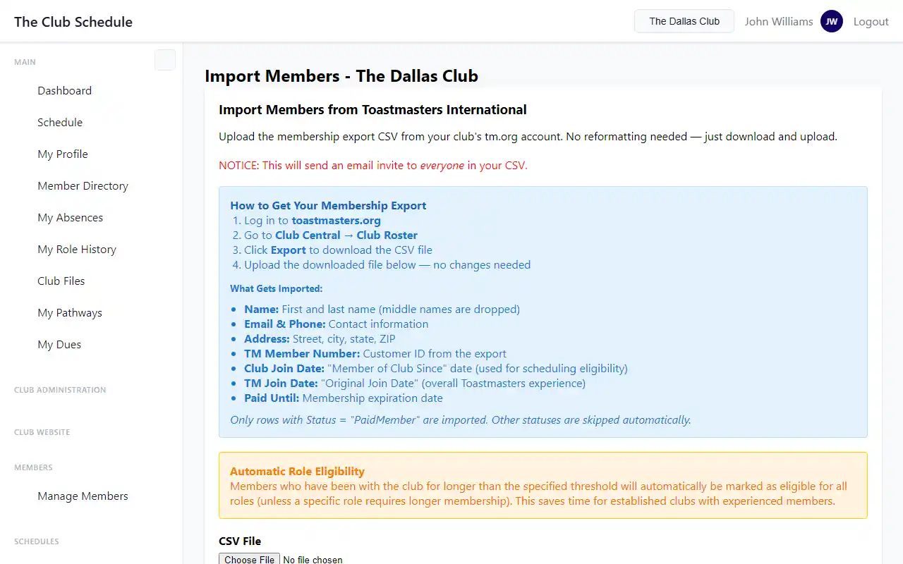 Import your entire club roster at once using a CSV file exported from Toastmasters International.