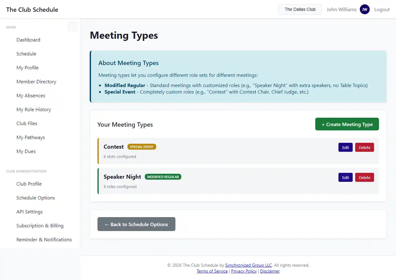 Meeting types let you configure different role sets for different kinds of meetings. Instead of every meeting using the same roles, you can create variations to match how your club actually operates.